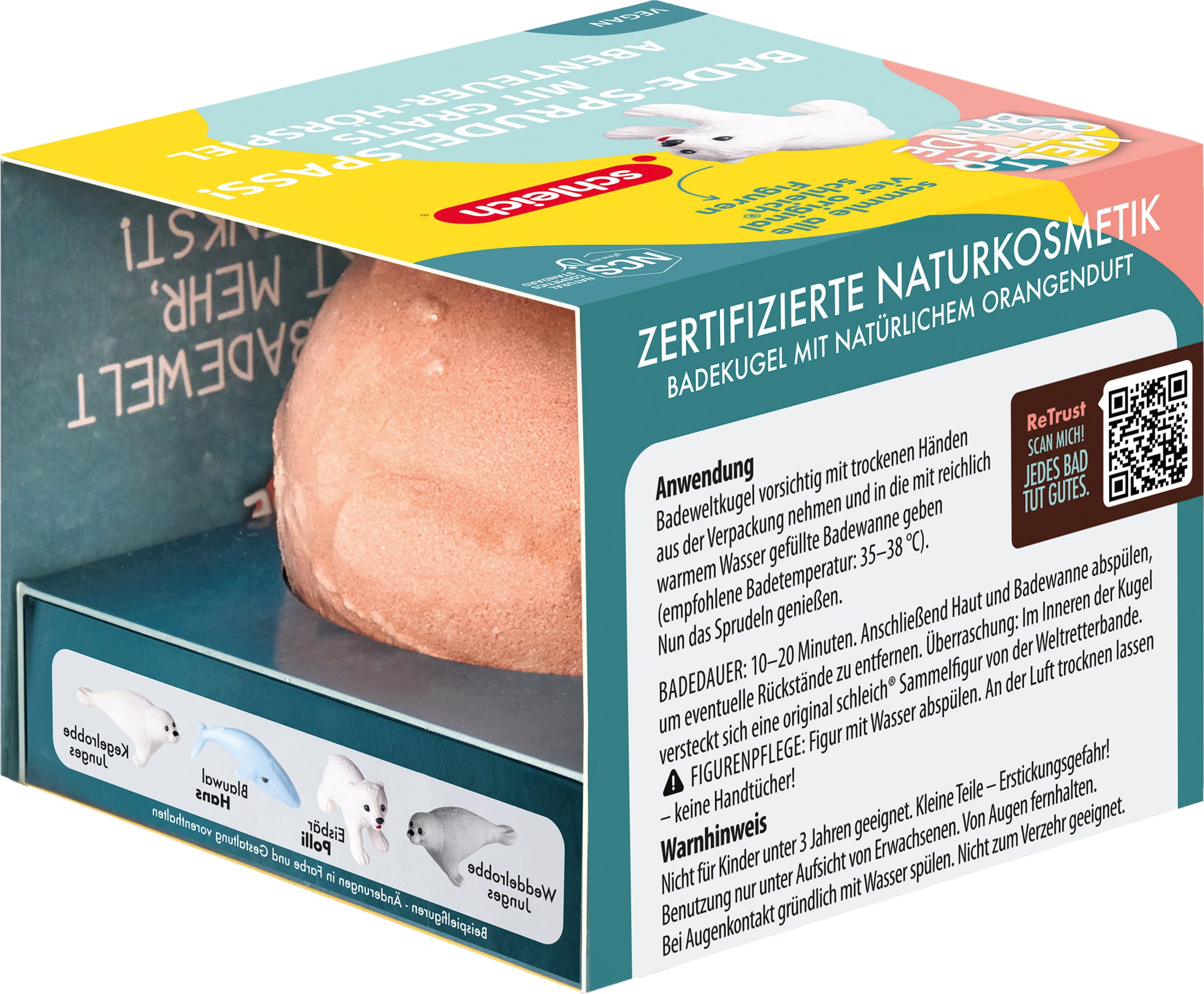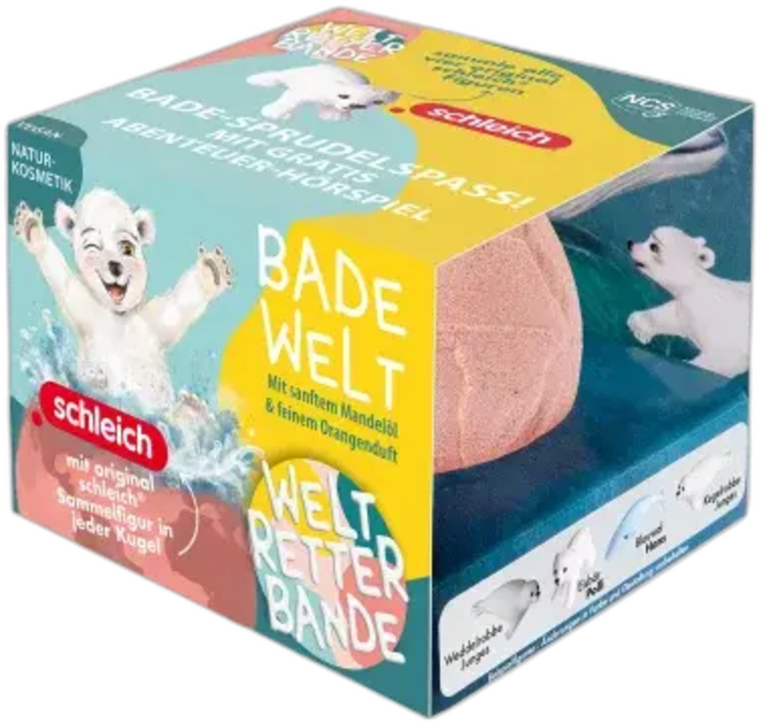 The bath bomb not only provides variety when bathing, but also contains a surprise in the form of an original Schleich collectable figurine. Gentle almond oil nourishes the skin, while the fine orange fragrance spreads a good mood. On the inside of the packaging, you can read all kinds of interesting facts about marine life and scan a QR code that leads to an interactive learning app and captivating audio plays.